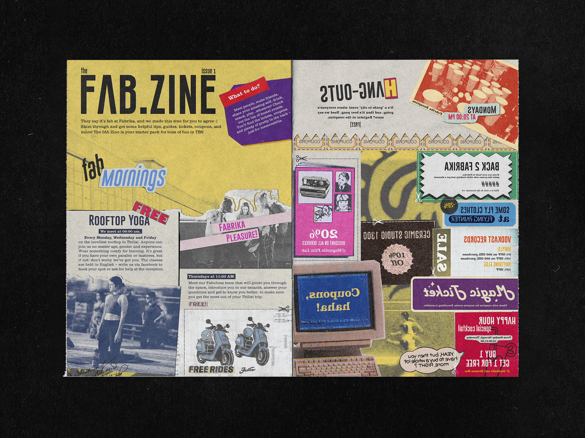 Fabzine was created as an interactive guide for Fabrika Hostel guests. Zine was filled with coupons, gifts and cutout experiences, along with tenant interviews.